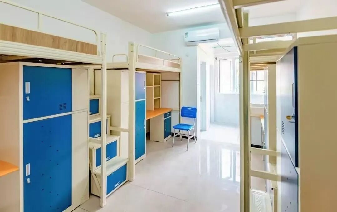 寝室是四人间,上铺下桌、有洗漱台、独卫、供应热水(卫生间提供热水的时间段一般是下午 5 点到晚上 12点),寝室有空调、阳台、洗衣机。